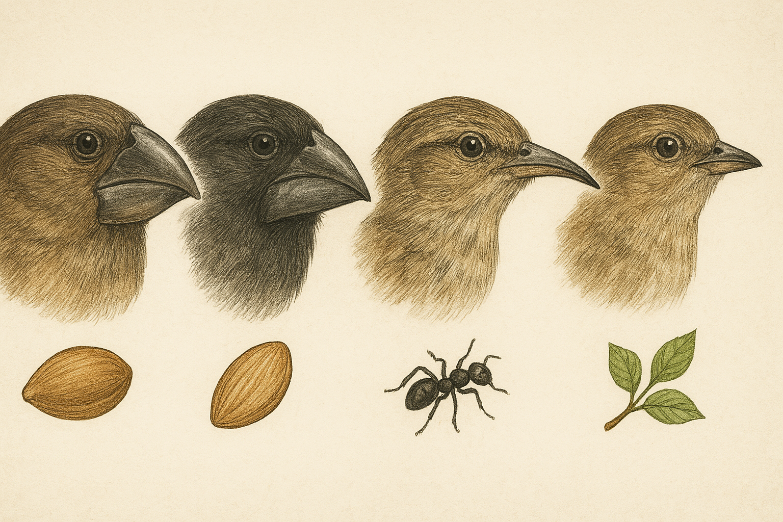 가장 유명한 예는 **핀치새(Finch)**입니다. 서로 다른 섬의 핀치들은 부리의 형태가 달랐고, 이는 섬마다 다른 먹이에 적응한 결과였습니다.